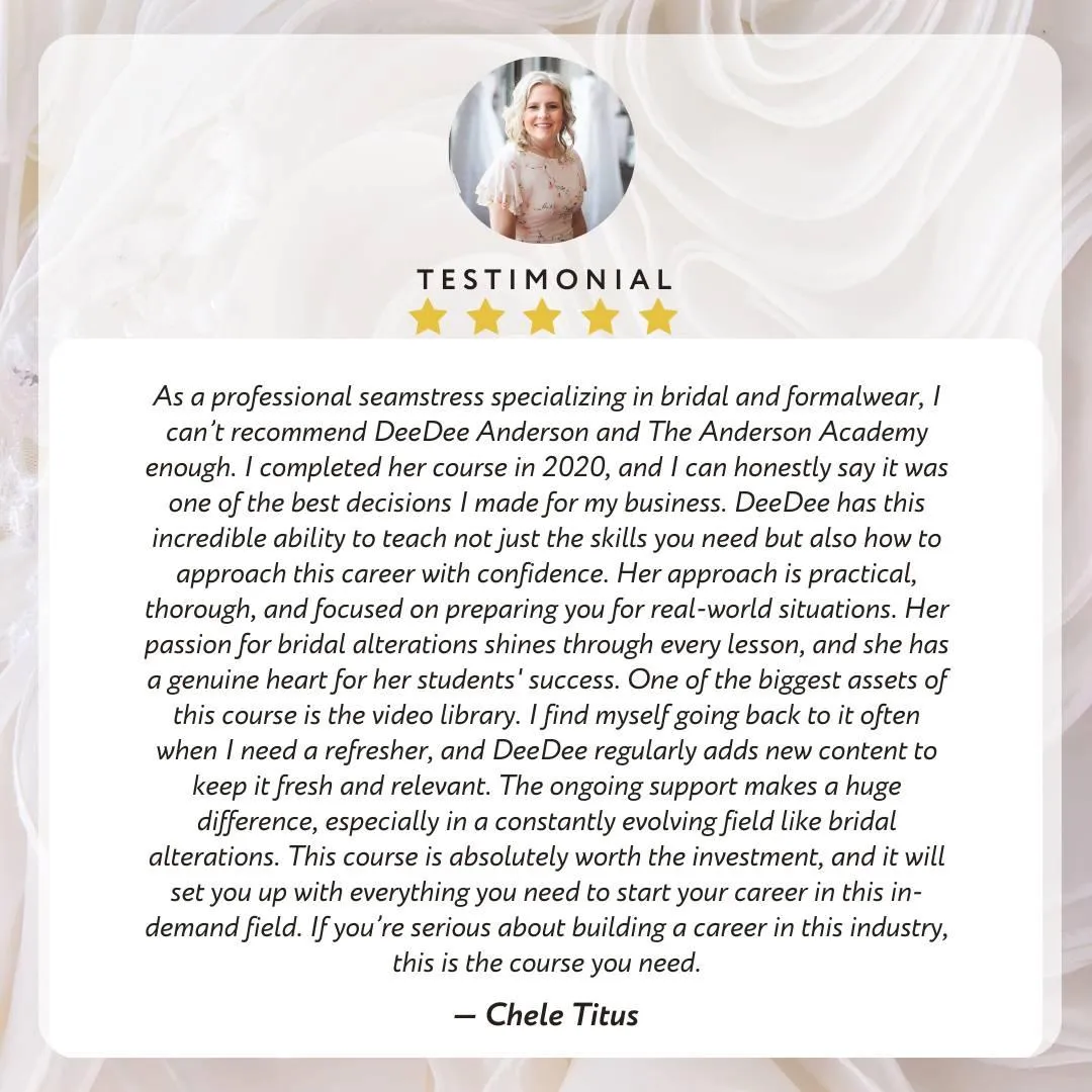 Bridal salons will BEG you to work with them when they discover you can save their damaged inventory. While other seamstresses turn away these high-value repair jobs, you'll confidently accept them and charge premium prices.